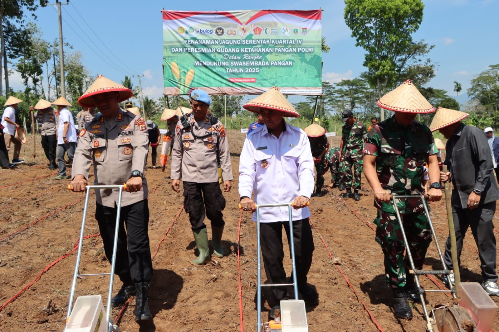 TANGGAMUS — Dalam rangka mendukung program ketahanan dan swasembada pangan nasional tahun 2025, Polres Tanggamus melaksanakan kegiatan Penanaman Jagung Serentak Kuartal IV sekaligus Peresmian Gudang Ketahanan Pangan Polri di Pekon Pulau Panggung, Kecamatan Pulau Panggung, Kabupaten Tanggamus, Rabu (8/10/2025).